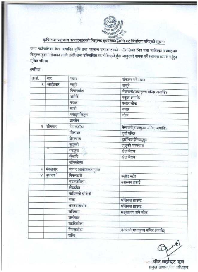 कृषि तथा पशुजन्य उत्पादनहरुको निशुल्क ढुवानीका लागि रुट निर्धारण गरिएको सूचना
