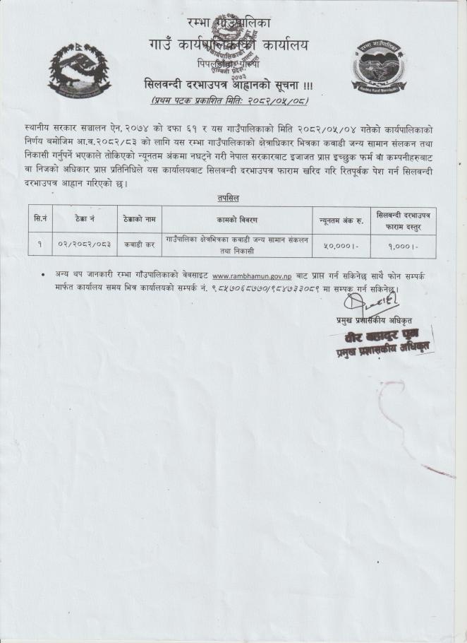गाउँपालिका क्षेत्रभित्रका कवाडी जन्य सामान संकलन तथा निकासी सम्बन्धी सूचना ।