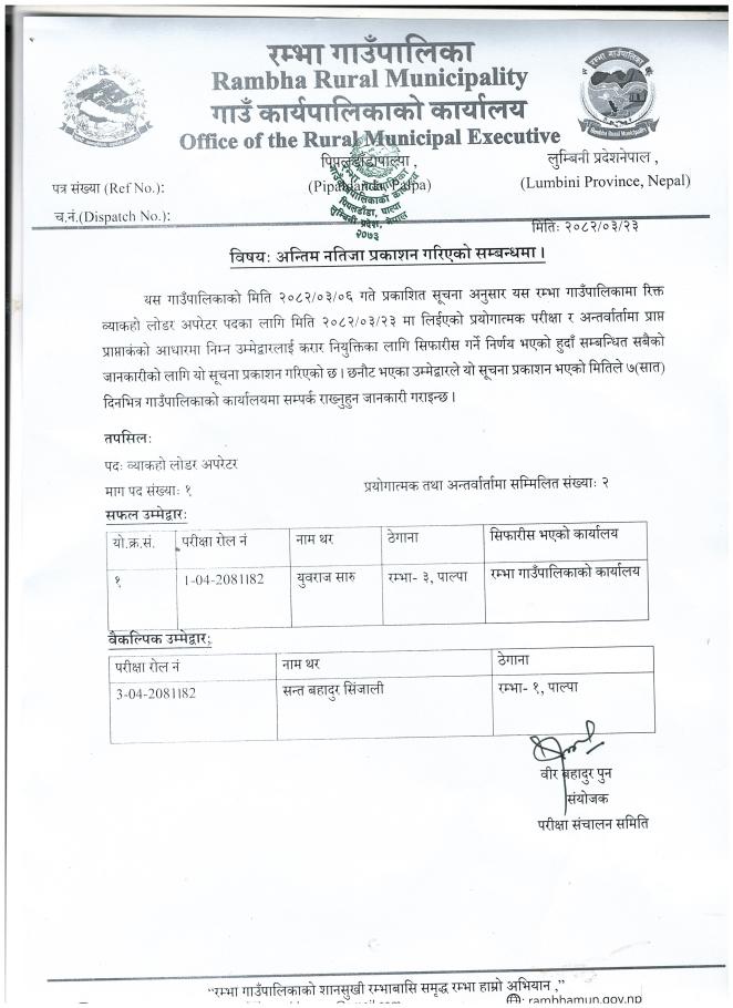 अन्तिम नतिजा प्रकाशन गरिएको समबन्धमा