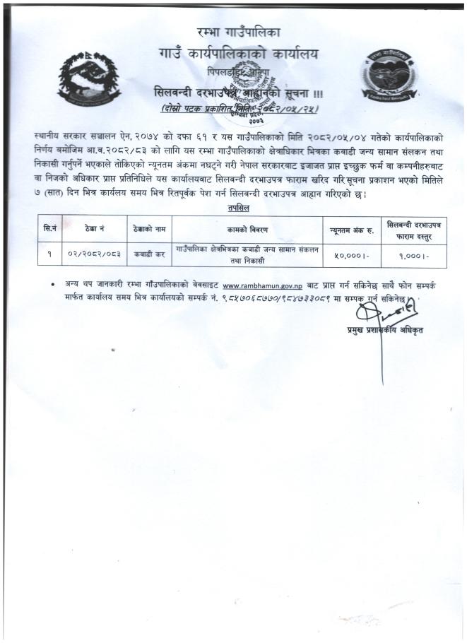 गाउँपालिका क्षेत्रभित्रका कवाडी जन्य सामान संकलन तथा निकासी सम्बन्धी सुचना (दोश्रो पटक प्रकाशित मिति :२०८२/०५/२५)
